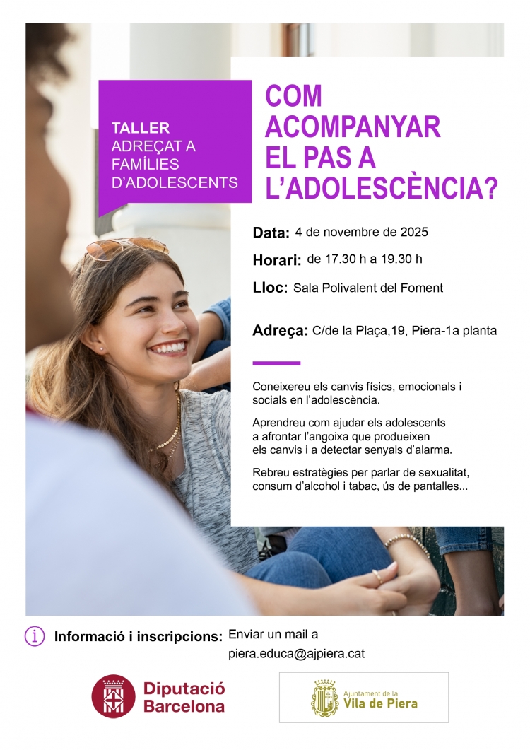 L’activitat tindrà lloc el 4 de novembre, de 17.30 h a 19.30 h, a la Sala Polivalent del Foment de Piera, i estarà a càrrec de l’empresa KÍDEM (Salut emocional i sexualitat), amb la col·laboració de la Diputació de Barcelona.